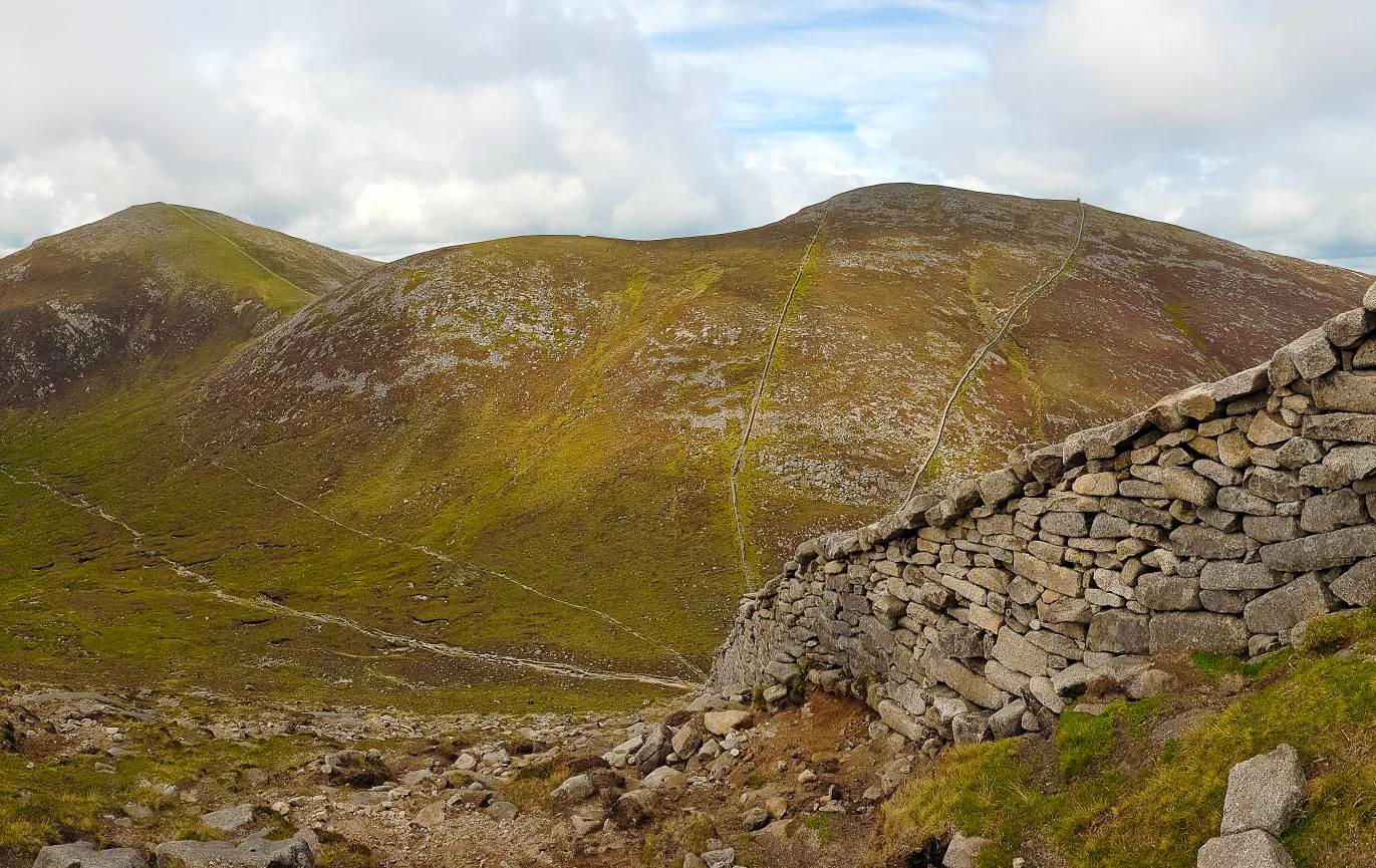 The well-maintained stony path follows the Mourne Wall upward, and while the climb is sustained, it never feels overwhelming.